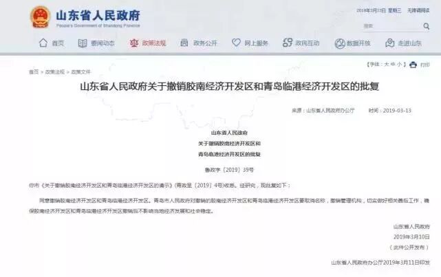 3月13日,山东省政府发布《关于撤销胶南经济开发区和青岛临港经济开发区的批复》,同意撤销胶南经济开发区和青岛临港经济开发区